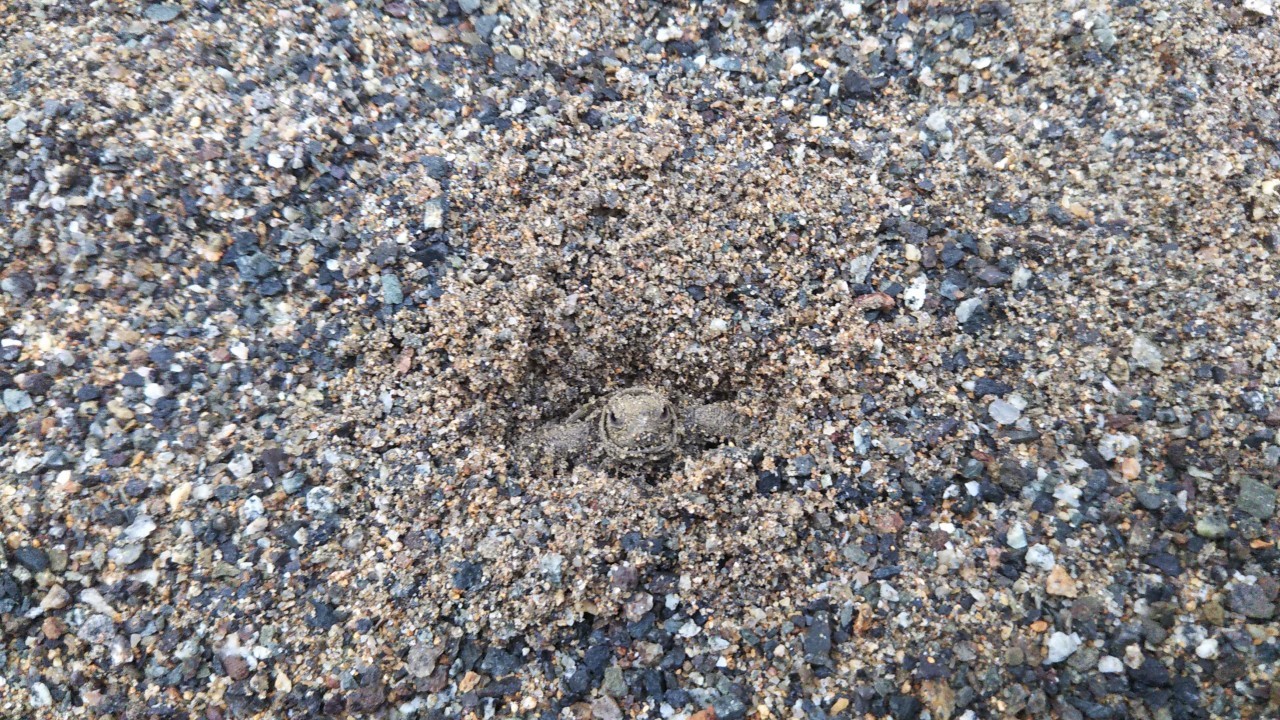 砂の中のアカチャンカメと にらめっこです。