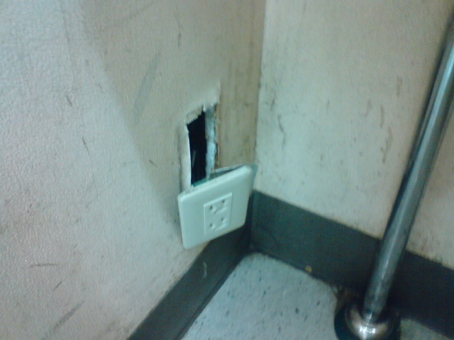 射水市で洗面所の下部にあるコンセントが飛び出したと修理依頼があり、電気屋さんと現場へ向かいました。