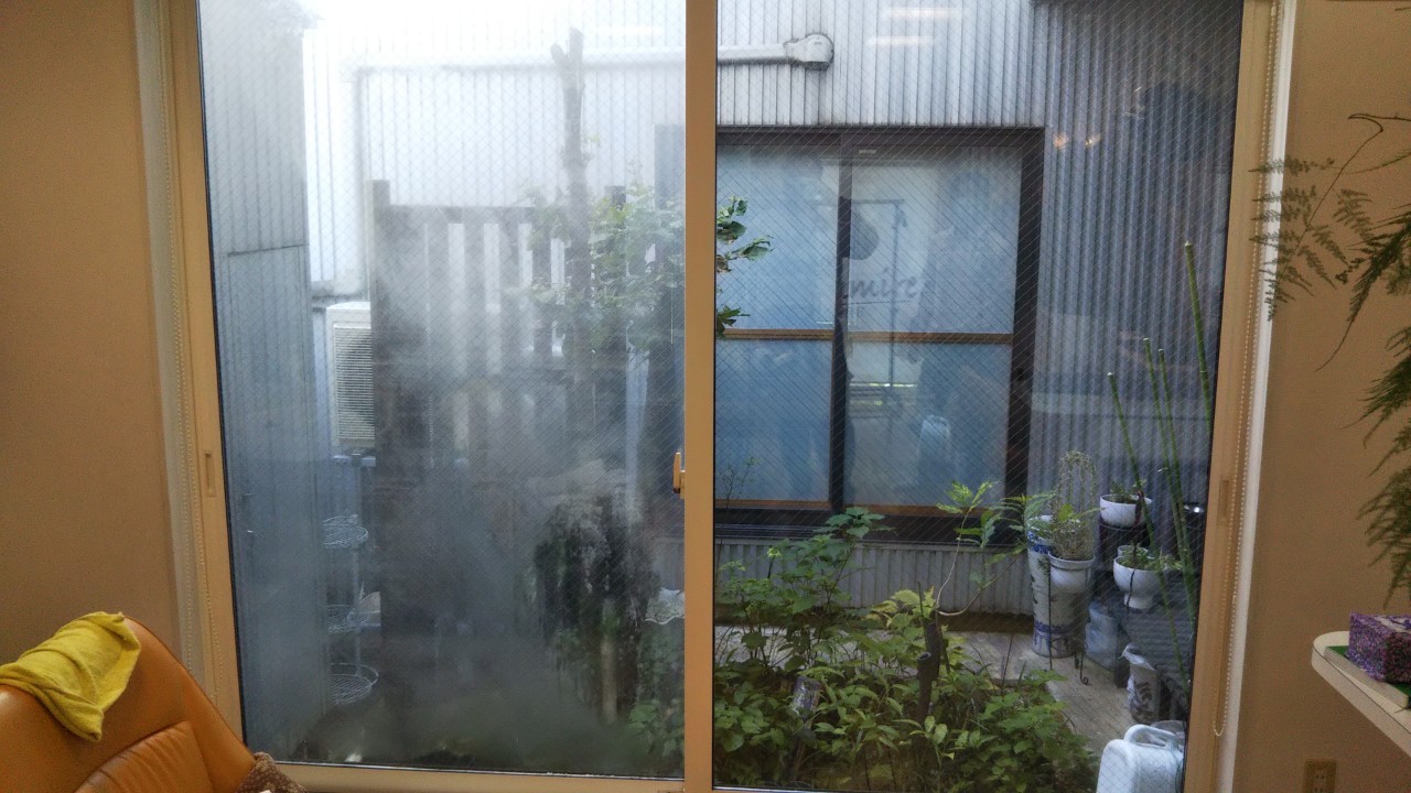 左側のペアガラスが内部結露をおこして 白く濁った状態になっています。