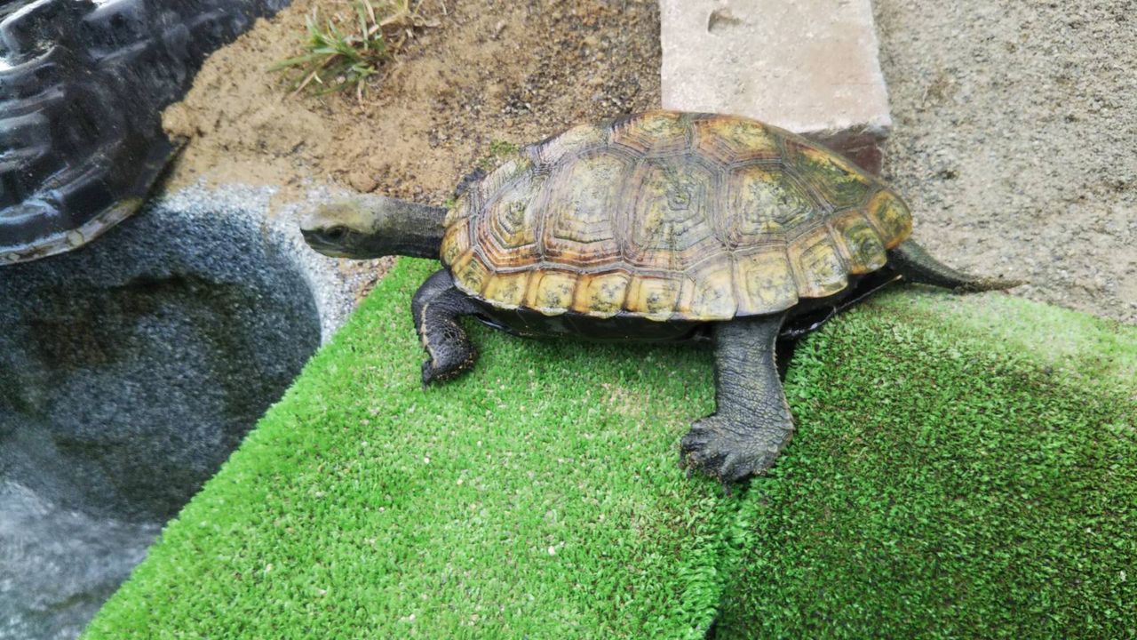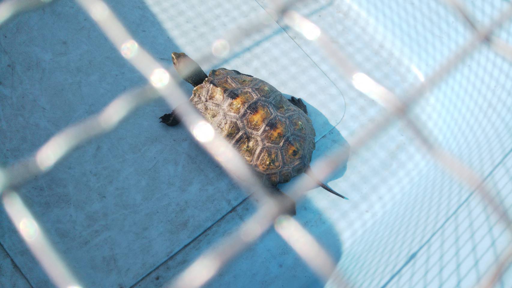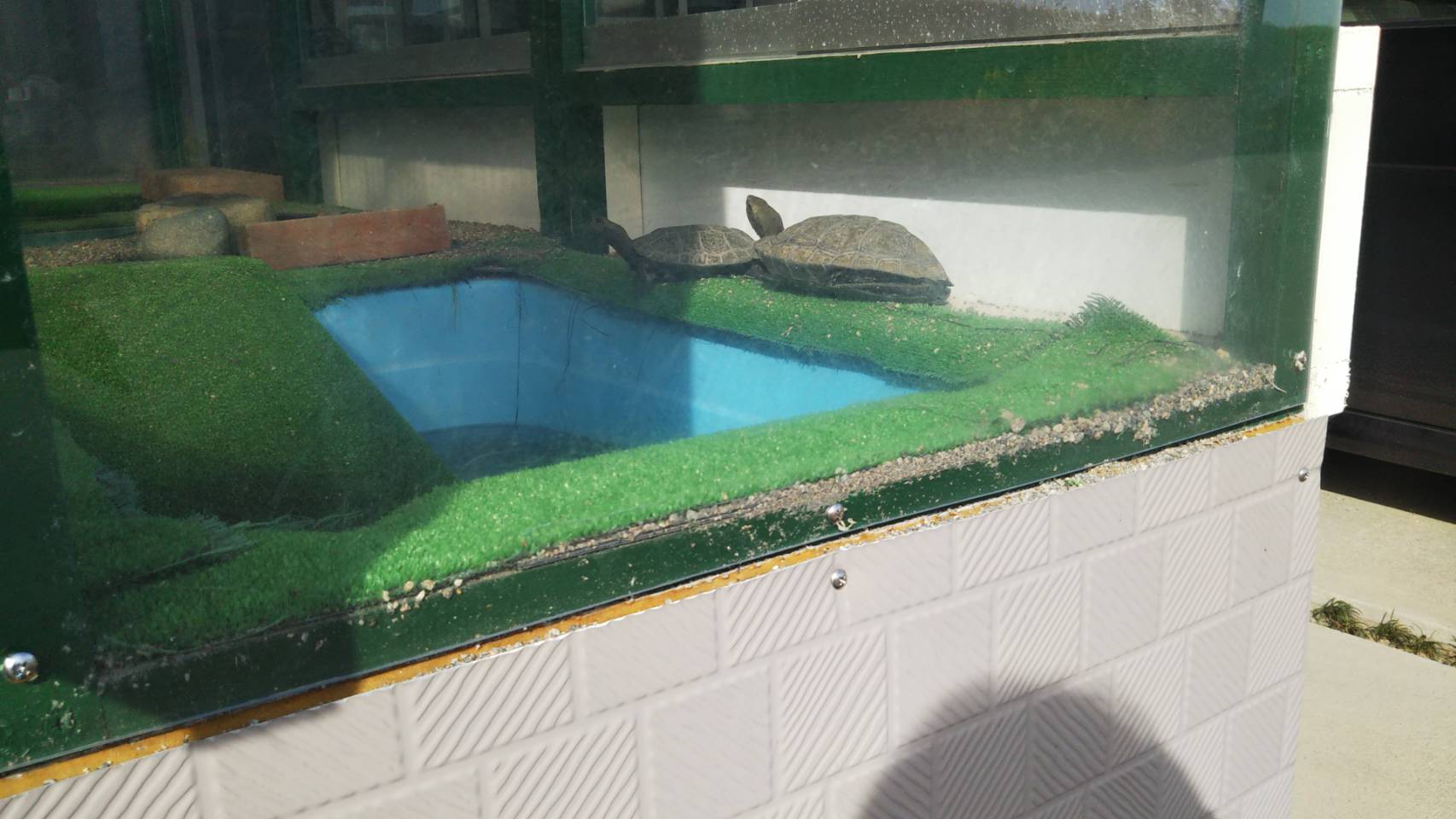 自宅 カーポート下の飼育スペースでは イシガメの♀(ウリ)・♂(スイカ)が