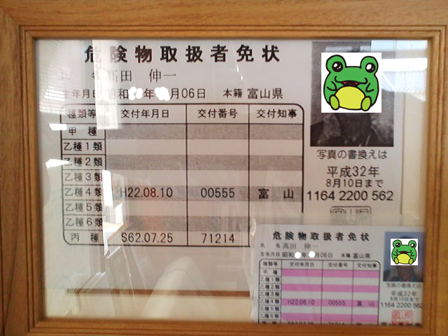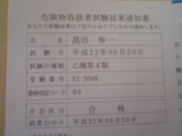入りました。 「危険物」といえば・・・ 乙4危険物という資格があった。と思い出し